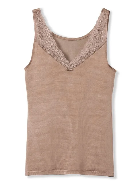 Tank Top mit elegantem V-förmigen Spitzeneinsatz. Durch die Dreifachplattierung ist auf der Haut reine Baumwolle zu spüren, während die Aussenseite schimmernde Viskose zeigt. Besonders wertvoll ist die reichhaltige, hochwertig verarbeite Spitze, die das Dekolleté verführerisch einfasst.
