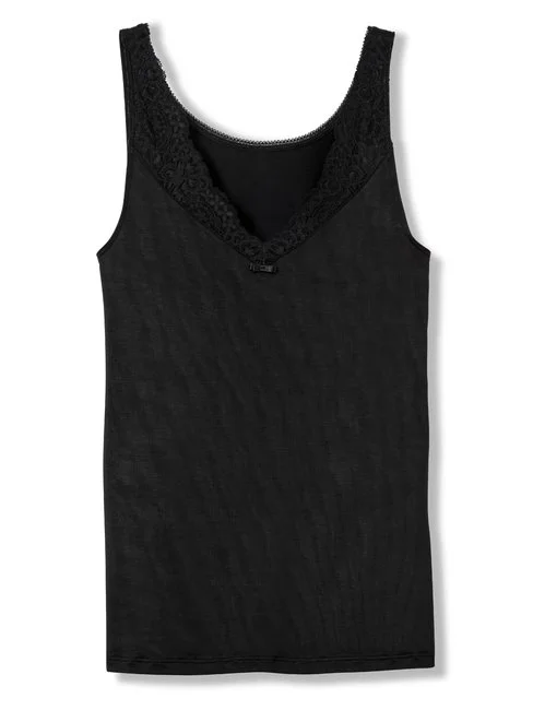 Tank Top mit elegantem V-förmigen Spitzeneinsatz. Durch die Dreifachplattierung ist auf der Haut reine Baumwolle zu spüren, während die Aussenseite schimmernde Viskose zeigt. Besonders wertvoll ist die reichhaltige, hochwertig verarbeite Spitze, die das Dekolleté verführerisch einfasst.