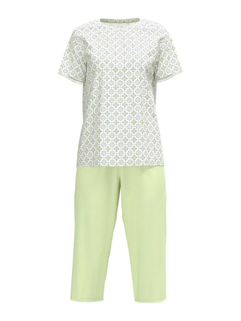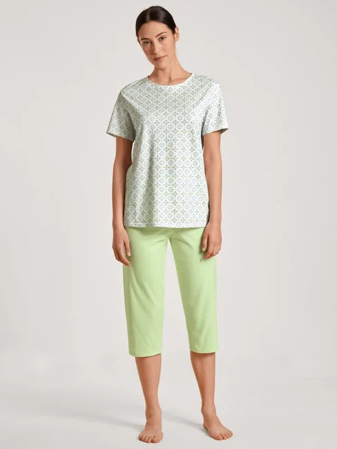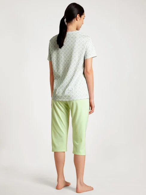 Capri-Pyjama aus der SPRING NIGHTS Serie von CALIDA. Softe, hochwertige Baumwolle in Single Jersey-Bindung umhüllt die Haut sanft und verwöhnt mit erholsamen Träumen. Der Mosaikprint im Zusammenspiel mit saisonalen Farbnuancen rundet das raffinierte Design ab.