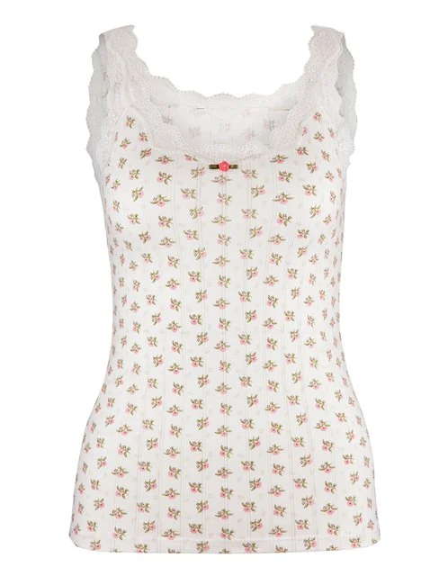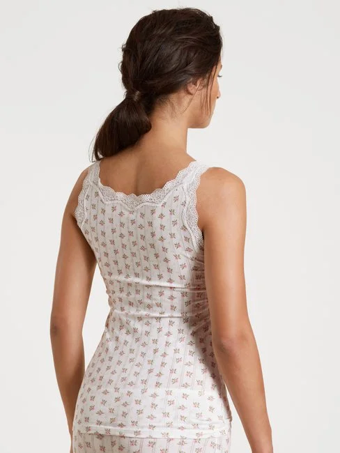 Nostalgischer Nadelzug, allerbeste Verarbeitung und hochwertige Baumwolle zeichnen die neue Serie TOUJOURS PRINT von CALIDA aus. Das schicke Unterhemd mit der besonders schön verarbeiteten Spitze, die bis in die Träger übergeht, kann auch wunderbar zur Oberbekleidung kombiniert werden. Das dezente Blumenmuster verleiht dem Shirt einen romantischen Touch.