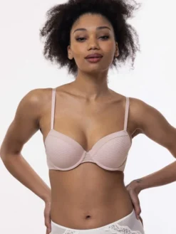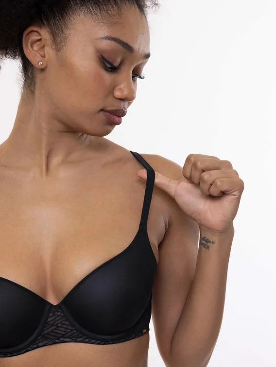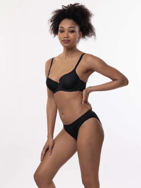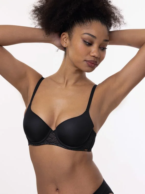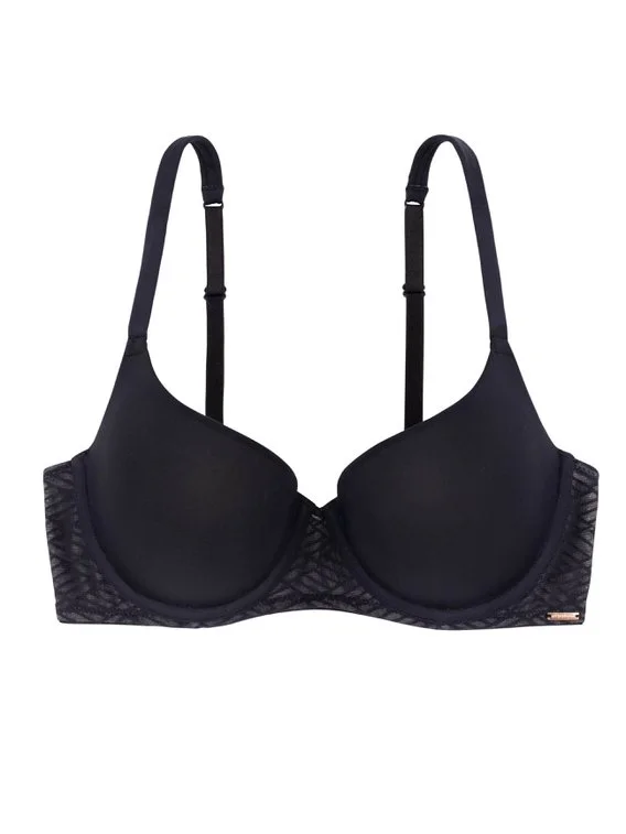 Der T-Shirt BH von DORINA aus der Serie „Leila“ überzeugt durch sein softes Hautgefühl dank der weichen Mikrofaser. Die Cups sind glatt gearbeitet um unter engen Oberteilen nicht aufzufallen. Durch die integrierten Bügel wird die Brust optimal unterstützt. Die wattierten Träger liegen sanft an den Schultern an und bieten besten Komfort. Das klassische Design des BHs wird durch die grafischen Muster der semitransparenten Seitenteile und dem Mittelsteg gekonnt aufgewertet. Ein schlichtes Basic mit Twist!