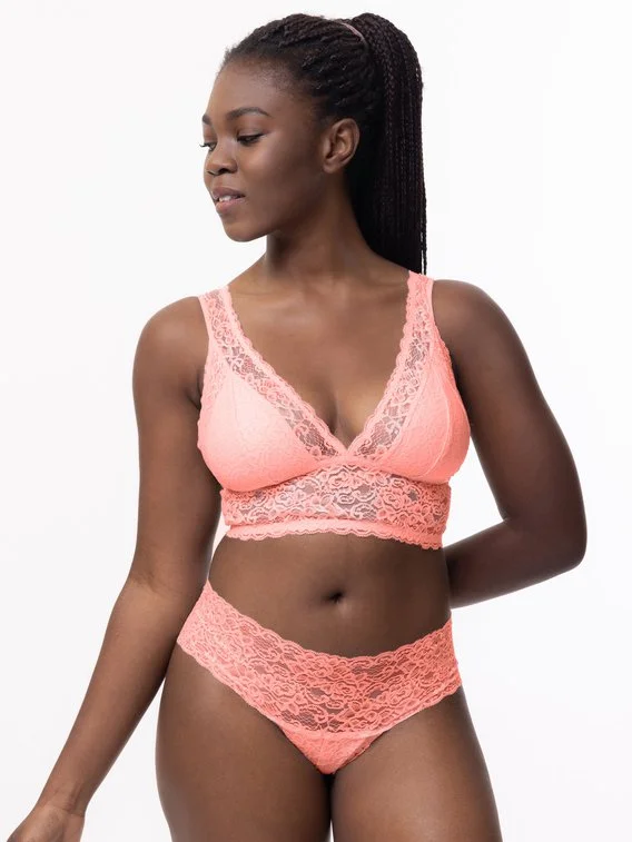 In luxuriöser Spitze und im praktischen Doppelpack, setzt sich der Triangel-BH aus der Serie „Lana“ von DORINA gekonnt in Szene. Weiches Stretchmaterial schmiegt sich angenehm an die weiblichen Konturen und zaubert eine natürliche Brustform. Unter einem weit ausgeschnittenen Oberteil darf der feminine Bralette gerne rausspitzen.