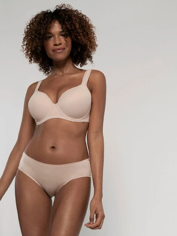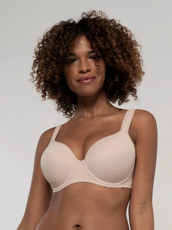 Der T-Shirt BH aus der Serie „Rachel“ von DORINA bietet auch bei großen Größen einen hervorragenden Tragekomfort. Die flache Verarbeitung und der klassische Full Cup-Schnitt eignen sich perfekt für enganliegende Kleidung. Der formgebende Bügel und die vorgeformten Cups zaubern eine schöne und natürliche Brust während die breiten, weichen Träger für einen angenehmen Sitz sorgen.