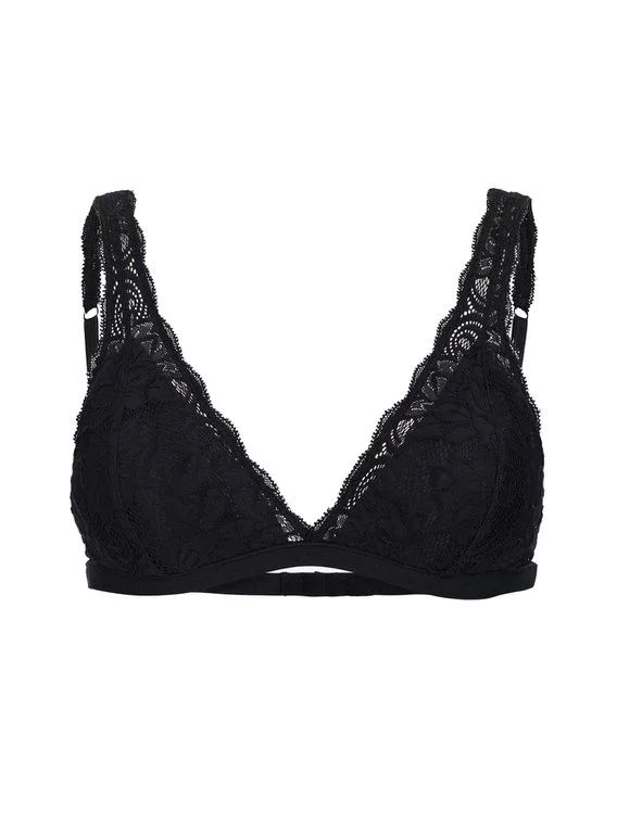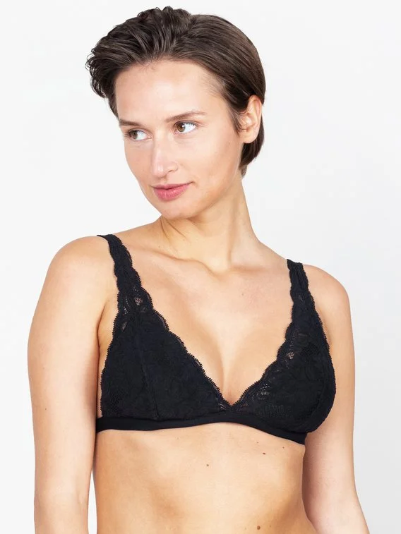 Gepaddeter Triangel-BH aus der Serie „Franziska“ von ERLICH TEXTIL. Die Cups und Träger des bügellosen BHs sind mit delikater Spitze aus recycelten Fasern dekoriert. Das Modell ist der erste Schalen-BH der Kölner Brand und die Cups vorgeformt. Das verspricht sicheren Halt im Alltag.